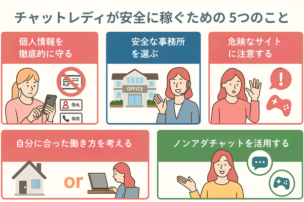 これらの内容をふまえて、自分自身をしっかり守りながら、チャットレディとして安心してお仕事に取り組んでくださいね。
