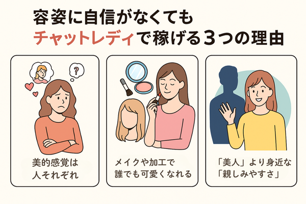 まずは「見た目に自信がなくても大丈夫!」と言える根拠を押さえておきましょう。チャットレディ業界では、外見に不安があっても稼げる理由が大きく3つあります。