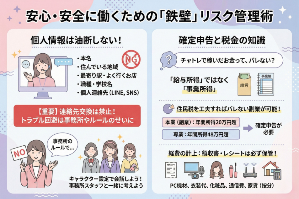 とはいえ「でも、ネットってなんか怖いし…」と思う方もいるかと思います。ここでは、チャットレディが安心・安全に働くための具体的なコツを解説します。