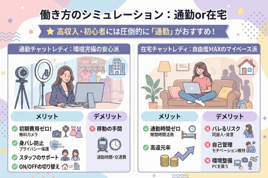 チャットレディには、大きく分けて「通勤」と「在宅」の2つの働き方があります。それぞれのライフスタイルに合わせた最適な選択ができるよう、詳細に比較しました。